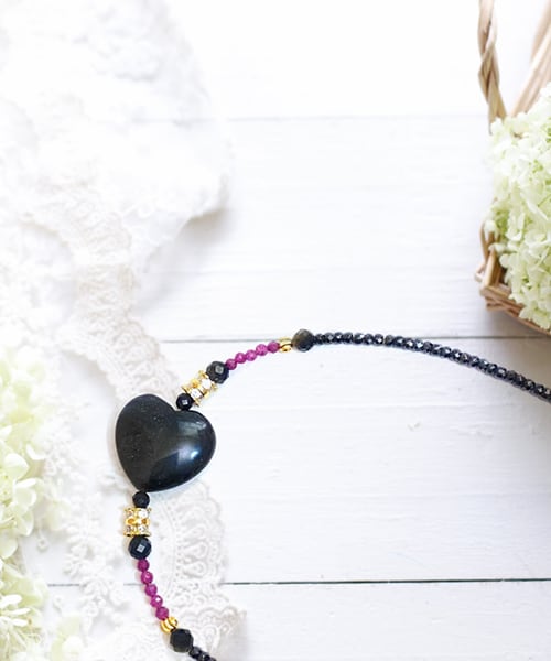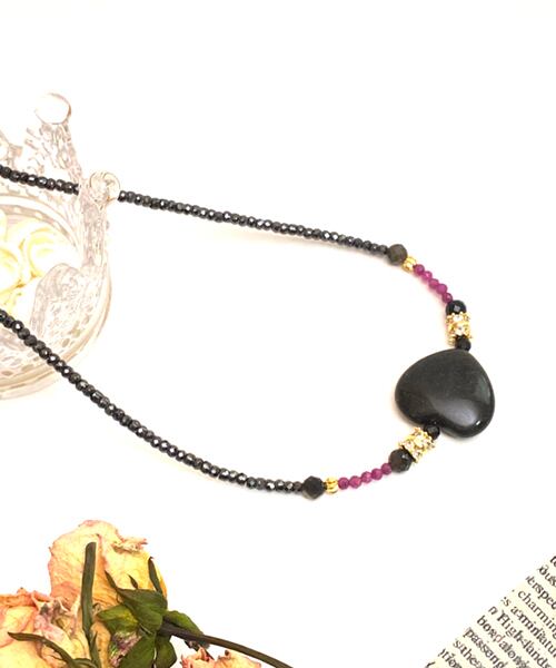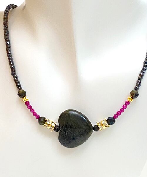 ゴールドのシラーが美しいハート型のゴールデンオブシディアンとブラックの輝きが美しいキュービックジルコニアを使用した、可愛いらしいけど力強いネックレスに仕上げました。ゴールデンオブシディアンの石言葉は本質、未来を見通す力。