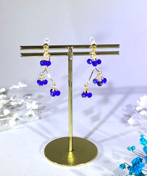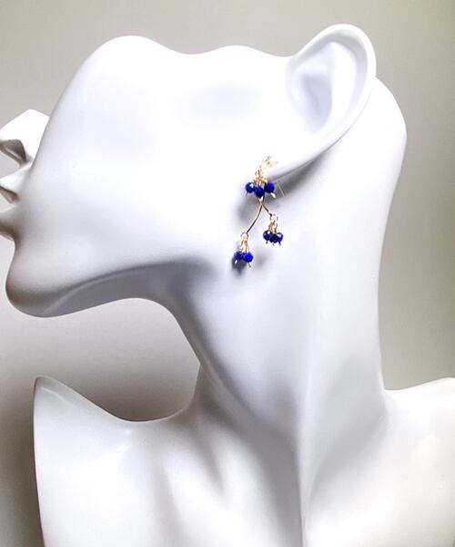 3㎜のラウンドカットのラピスラズリが輝く、シャンデリア風ピアスに仕上げました。