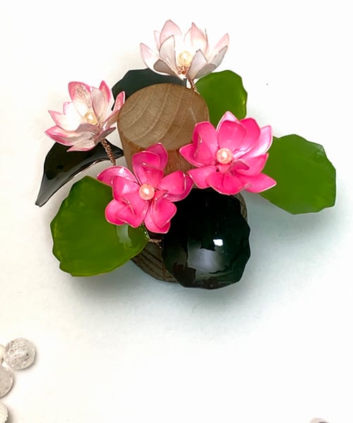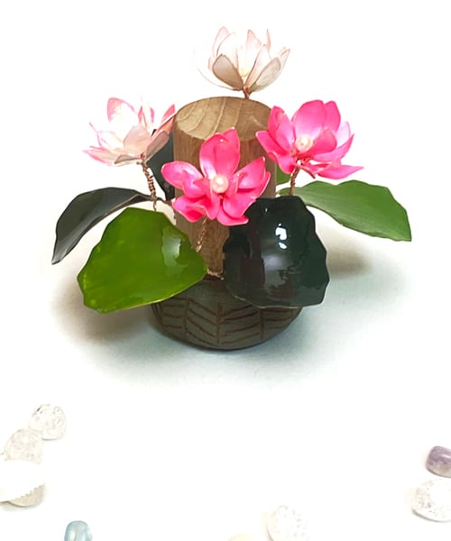 アロマウッド(ブナ)のディフューザーに蓮の花を飾ったワイヤーアート作品です。台座に使用している陶器も一つ一つ手作りしています。玄関や寝室に、アロマの香りとお花をお届け致します。クリアケースから出してお使いください。